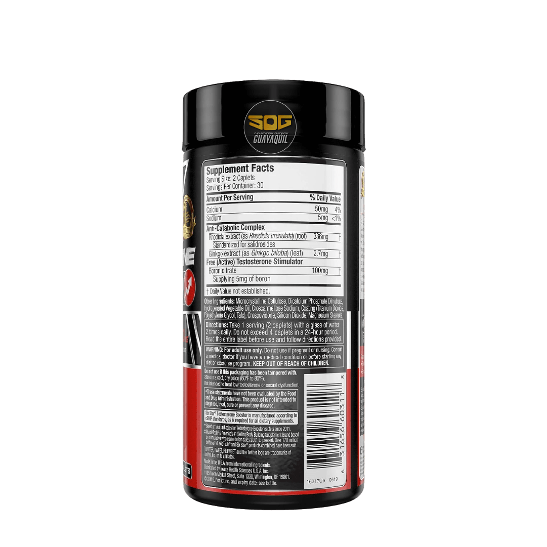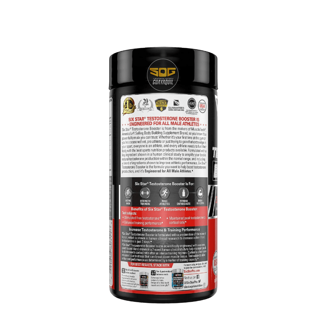 Six Star® Testosterone Booster está formulado con una dosis precisa de boro mineral, que se ha demostrado en investigaciones clínicas en humanos para aumentar la testosterona activa (gratis) en solo 7 días. Six Star® Testosterone Booster también está diseñado científicamente con una combinación única basada en plantas que se muestra en un estudio clínico en humanos de 7 semanas para ayudar a mantener la relación pico de testosterona a cortisol después de un régimen de entrenamiento intenso. El cortisol es una hormona liberada debido al estrés que puede descomponer el tejido muscular. En el mismo estudio, los sujetos de prueba también mejoraron el rendimiento según lo determinado por un marcador de capacidad de entrenamiento.